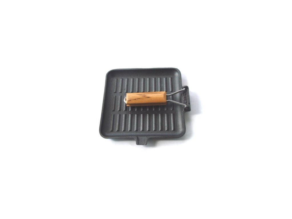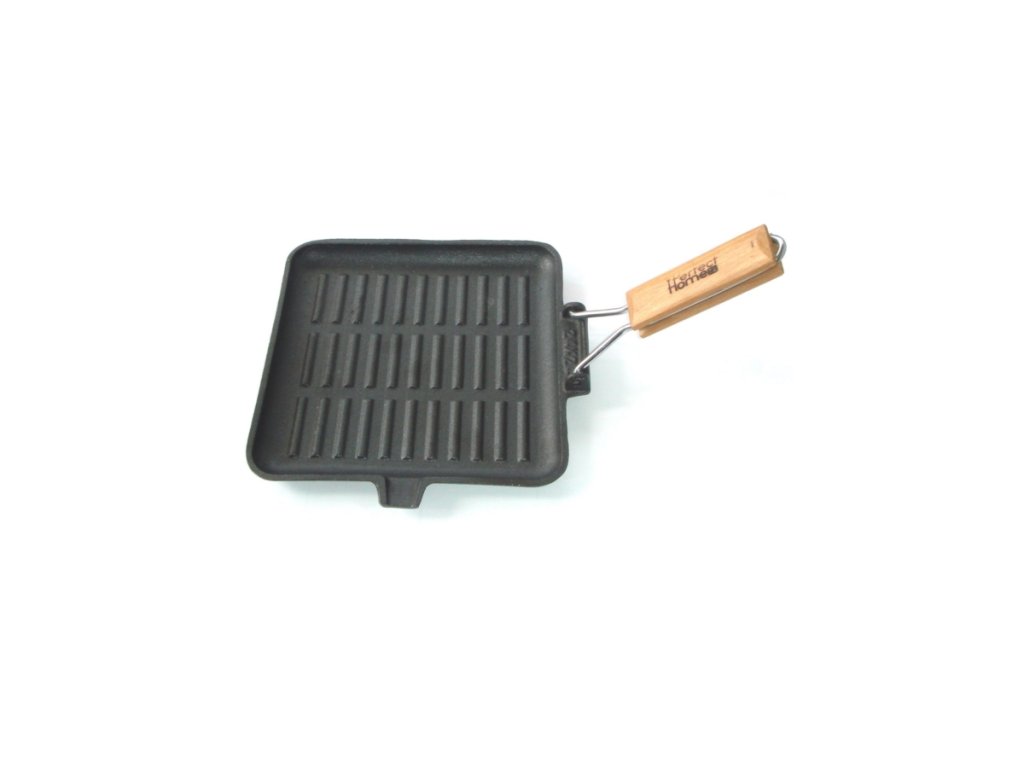 Popis produktu – litinová grilovací deska 24x24cm s rukojetí. Materiál: litina, kov, dřevo. Velikost:24 * 24 cm, výška 1,5 cm. Hmotnost:1,65 kg. Lze použít: na otevřeném ohni (dbejte na dřevěnou rukojeť!), Na plynovém nebo elektrickém sporáku (použijte rukavice na pečení!)Čištění: Před prvním použitím umyjte neutrálním tekutým čisticím prostředkem na nádobí, důkladně osušte, poté namažte a teplo. Po každém použití umyjte, důkladně osušte a namažte tukem, aby nedošlo ke korozi.